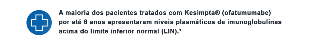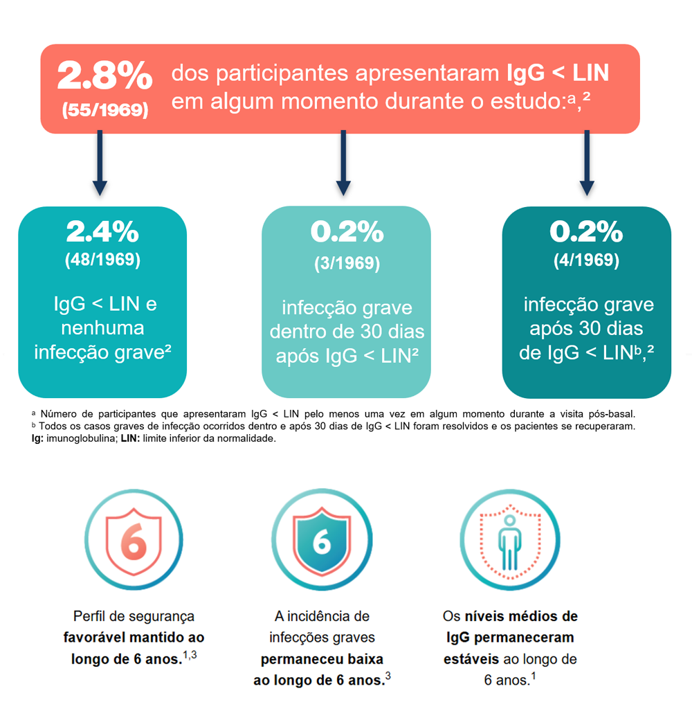 Enquanto os níveis médios de IgG permaneceram estáveis (97,2% dos pacientes acima do LIN), os níveis médios de IgM permaneceram acima do limite inferior normal em 65,9% dos pacientes, sem associação clinicamente significativa entre reduções nos níveis de Ig e risco de infecções graves.1