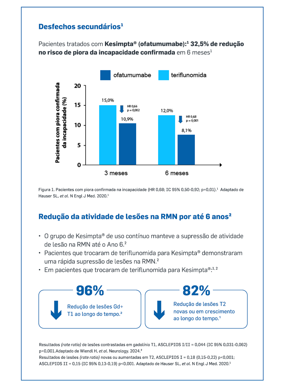 1. Gärtner J, Hauser SL, Bar-Or A, et al. Efficacy and safety of ofatumumab in recently diagnosed, treatment-naive patients with multiple sclerosis: Results from ASCLEPIOS I and II. Mult Scler. 2022;28(10):1562-75. 2. Bula de KESIMPTA® para profissionais. VPS7. Aprovada pela Anvisa em 17/02/2025. 3. Wiendl H, Hauser S, Nicholas J, et al. Longer-term safety and efficacy of ofatumumab in people with relapsing multiple sclerosis for up to 6 years (P9-6.010). Neurology. 2024;102(17 Suppl 1). 4. Ross AP, Besser C, Naval S, Stoneman D, Gaunt H, Barker N. Patient and nurse preference for Sensoready autoinjector pen versus other autoinjectors in multiple sclerosis: results from a pilot multicenter survey. BMC Neurol. 2023;23(1):85. 5. Terlizzi RD, King M, Blohm C. Usability validation of the Sensoready® pen in patients with relapsing multiple sclerosis. Ther Deliv. 2023;14(4):259–68. 6. Ministério da Saúde, Agência Nacional de Saúde. RESOLUÇÃO NORMATIVA - RN Nº 584 DE 7 DE AGOSTO DE 2023. Diário Oficial da União 151; 09/08/2023; Sec. 1:85. Acesso em: 27/01/2025. Disponível em: https://www.gov.br/ans/pt-br/arquivos/acesso-ainformacao/ participacao-da-sociedade/consultas-publicas/cp112/RN_584.pdf. 7. Hauser SL, Bar-Or A, Cohen JA, et al; ASCLEPIOS I and ASCLEPIOS II trial groups. Ofatumumab versus teriflunomide in multiple sclerosis. N Engl J Med. 2020;383(6):546-57. 8. Cohen JA, Hauser SL, Cross AH, et al. Five-year safety of ofatumumab in people living with relapsing multiple sclerosis. P8-004. Apresentado no: 75th American Academy of Neurology Annual Meeting; 22-27 de abril de 2023; Boston, Massachusetts, EUA.
