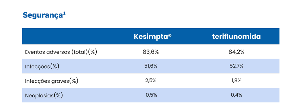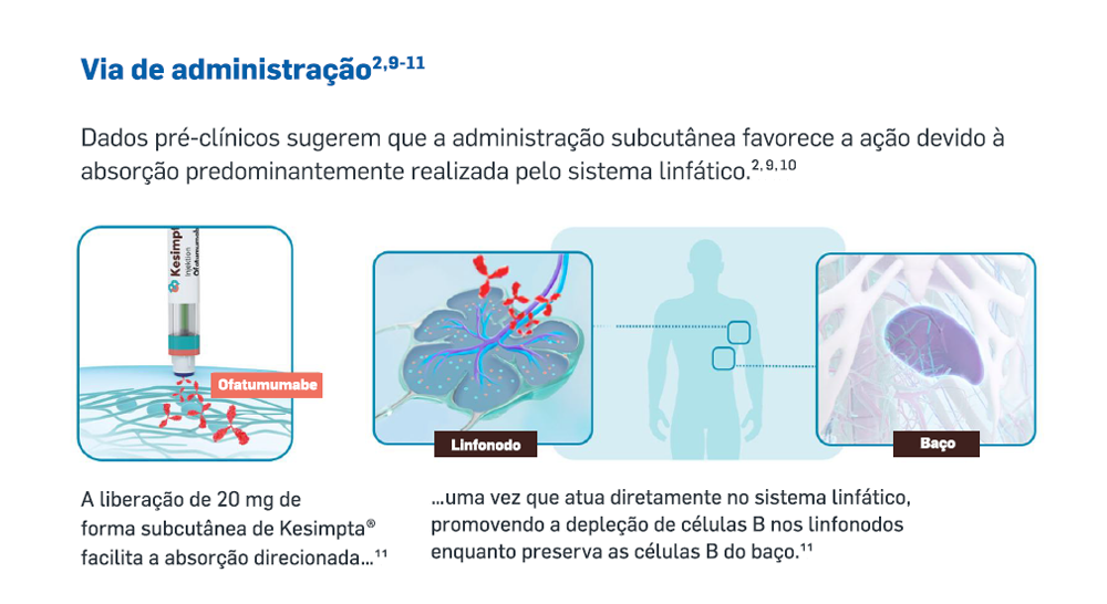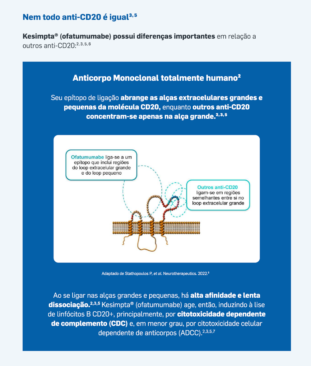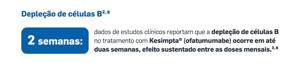 1. Gärtner J, Hauser SL, Bar-Or A, et al. EEfficacy and safety of ofatumumab in recently diagnosed, treatment-naive patients with multiple sclerosis: Results from ASCLEPIOS I and II. Mult Scler. 2022;28(10):1562-75. 2. Bula de KESIMPTA® para profissionais. VPS7. Aprovada pela Anvisa em 17/02/2025. 3. Stathopoulos P, Dalakas MC. Evolution of Anti-B Cell Therapeutics in Autoimmune Neurological Diseases. Neurotherapeutics. 2022;19(3):691–710. 4. Hauser SL. The Charcot Lecture | beating MS: a story of B cells, with twists and turns. Mult Scler. 2015;21(1):8–21. 5. de Sèze J, Maillart E, Gueguen A, et al. Anti-CD20 therapies in multiple sclerosis: From pathology to the clinic. Front Immunol. 2023;14:1004795. 6. Hauser SL, Kappos L, Bar-Or A, et al. The Development of Ofatumumab, a Fully Human Anti-CD20 Monoclonal Antibody for Practical Use in Relapsing Multiple Sclerosis Treatment. Neurol Ther. 2023;12(5):1491–515. 7. Klein C, Lammens A, Schäfer W, et al. Epitope interactions of monoclonal antibodies targeting CD20 and their relationship to functional properties. MAbs. 2013;5(1):22–33. 8. Hauser SL, Bar-Or A, Cohen JA, et al.; ASCLEPIOS I and ASCLEPIOS II Trial Groups. Ofatumumab versus Teriflunomide in Multiple Sclerosis. N Engl J Med. 2020;383(6):546–57. 9. Migotto MA, Bhalla R, Mardon K, et al. Comparison of Biodistribution Following Subcutaneous and Intravenous Administration of a Novel Zirconium-89 Labeled Anti-CD20 Antibody Using Imaging. Neurology. 2018;90(Suppl. 15). 10. Huck C, Leppert D, Wegert V, et al. Low-Dose Subcutaneous Anti-CD20 Treatment Depletes Disease Relevant B Cell Subsets and Attenuates Neuroinflammation. J Neuroimmune Pharmacol. 2019;14(4):709-19. 11. Hauser SL, Cross AH, Winthrop K, et al. Safety experience with continued exposure to ofatumumab in patients with relapsing forms of multiple sclerosis for up to 3.5 years. Mult Scler. 2022;28(10):1576-90.