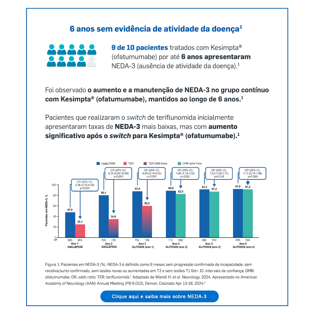 1. Wiendl, H., Hauser, H., Nicholas JA, et al. “Longer-term Safety and Efficacy of Ofatumumab in People with Relapsing Multiple Sclerosis for Up to 6 Years.” (P9-6.010). https://doi.org/10.1212/WNL.0000000000205570. Available at: https://www.medcommshydhosting.com/MSKnowledgecenter/aan/2024/AAN24_ALITHIOS_6_Year_efficacy_and_safety_in_overall_Wiendl_Poster_P9-010.pdf; 2. Wiendl H, et al. “Long-Term Ofatumumab Treatment Over 6 Years Did Not Increase the Risk of Serious Infections.” American Academy of Neurology Meeting, San Diego, CA, USA, April 5–9, 2025; 3. Pardo G, Hauser, Stephen L et al. “Longer-term (Up to 6 Years) Efficacy of Ofatumumab in People with Recently Diagnosed and Treatment-naive Relapsing Multiple Sclerosis.” (S31.003) https://doi.org/10.1212/WNL.0000000000206274. 4. Bula de Profissional da Saúde do produto Kesimpta®. Versão VPS7. Aprovado pela ANVISA em 17.02.2025.