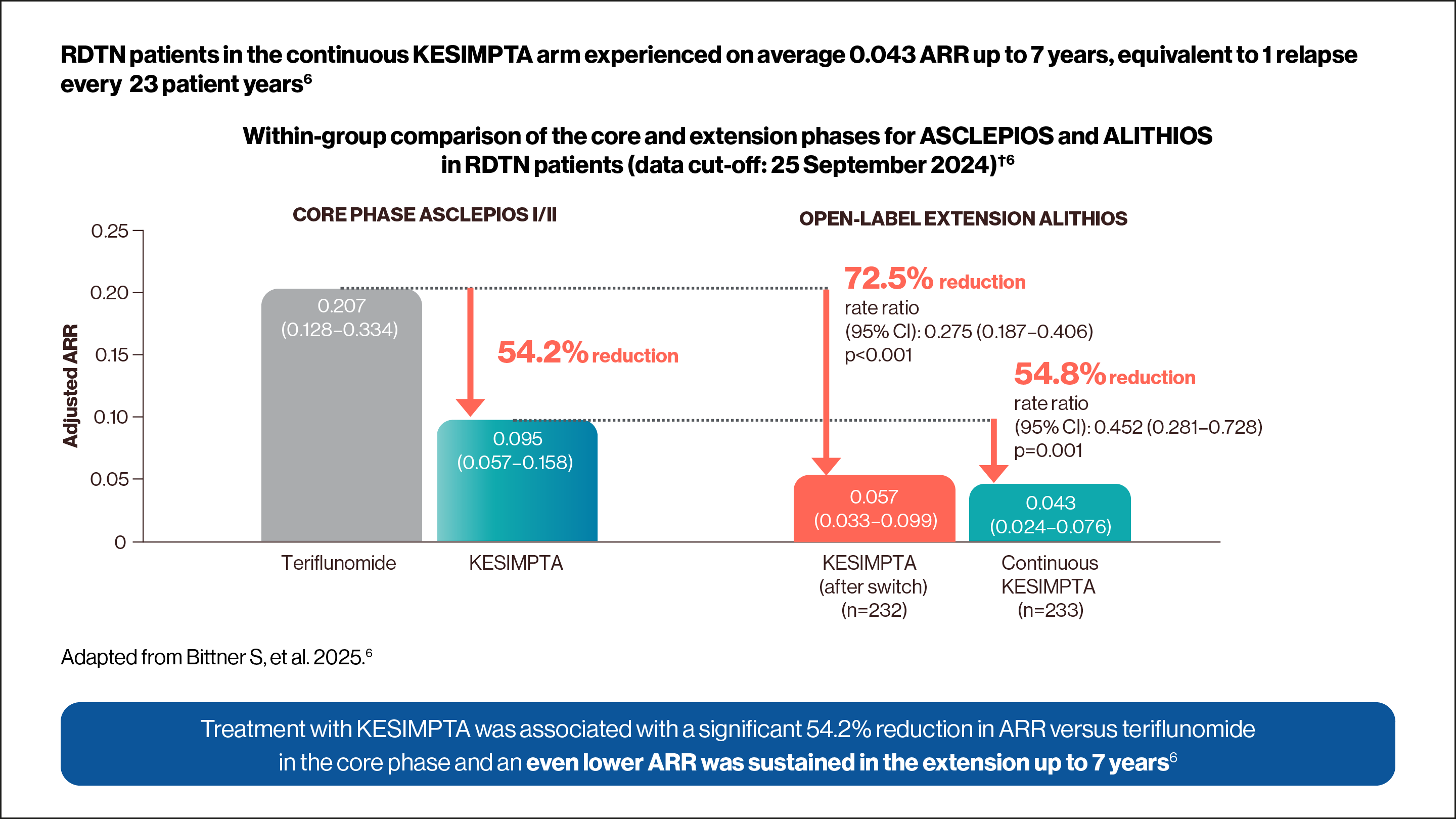 KESIMPTA has demonstrated efficacy in ASCLEPIOS I and II (2-year core studies), two Phase III randomised, double-blind, double-dummy, active comparator-controlled, parallel-group, multicentre pivotal trials, comparing a range of outcomes to active comparator teriflunomide in 1882 patients with RMS, following patients for up to 6 years (including the 4-year extension phase, ALITHIOS study).1–3
