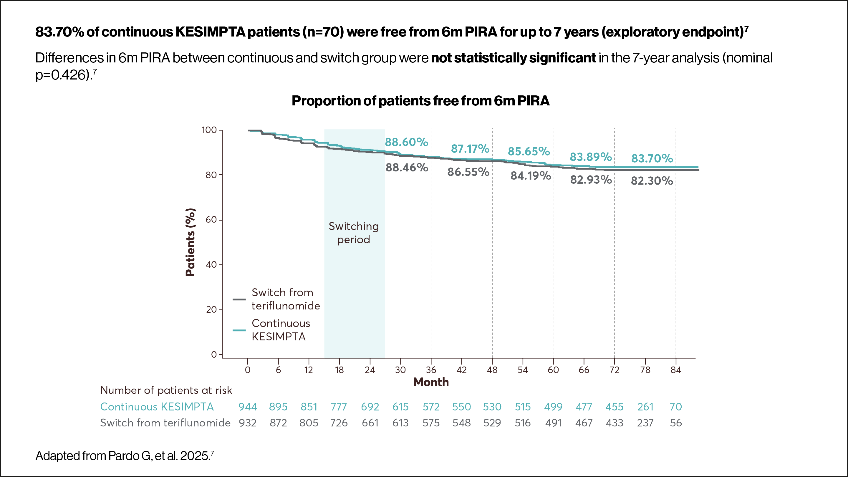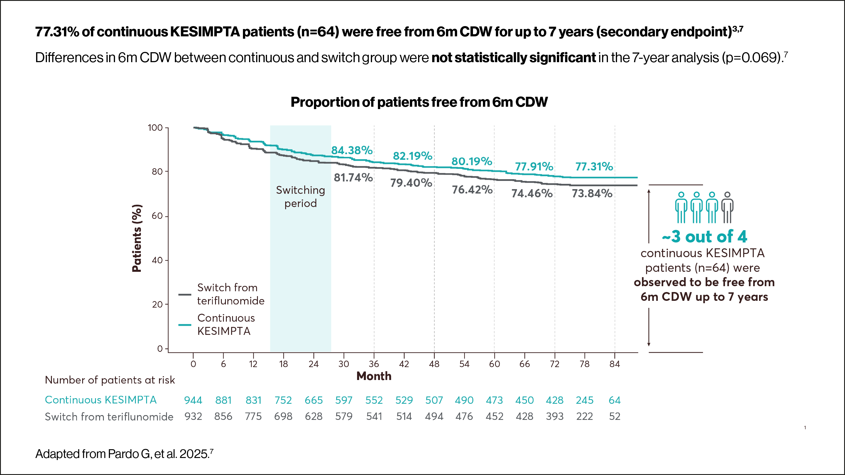 Up to Year 7: An almost complete suppression of Gd+ T1 lesion activity (95.6% observed reduction for KESIMPTA vs teriflunomide in ASCLEPIOS I/II) was observed to be maintained from Years 1 to 7 in the continuous KESIMPTA group and from Years 3 to 7 in the switch group5 |
